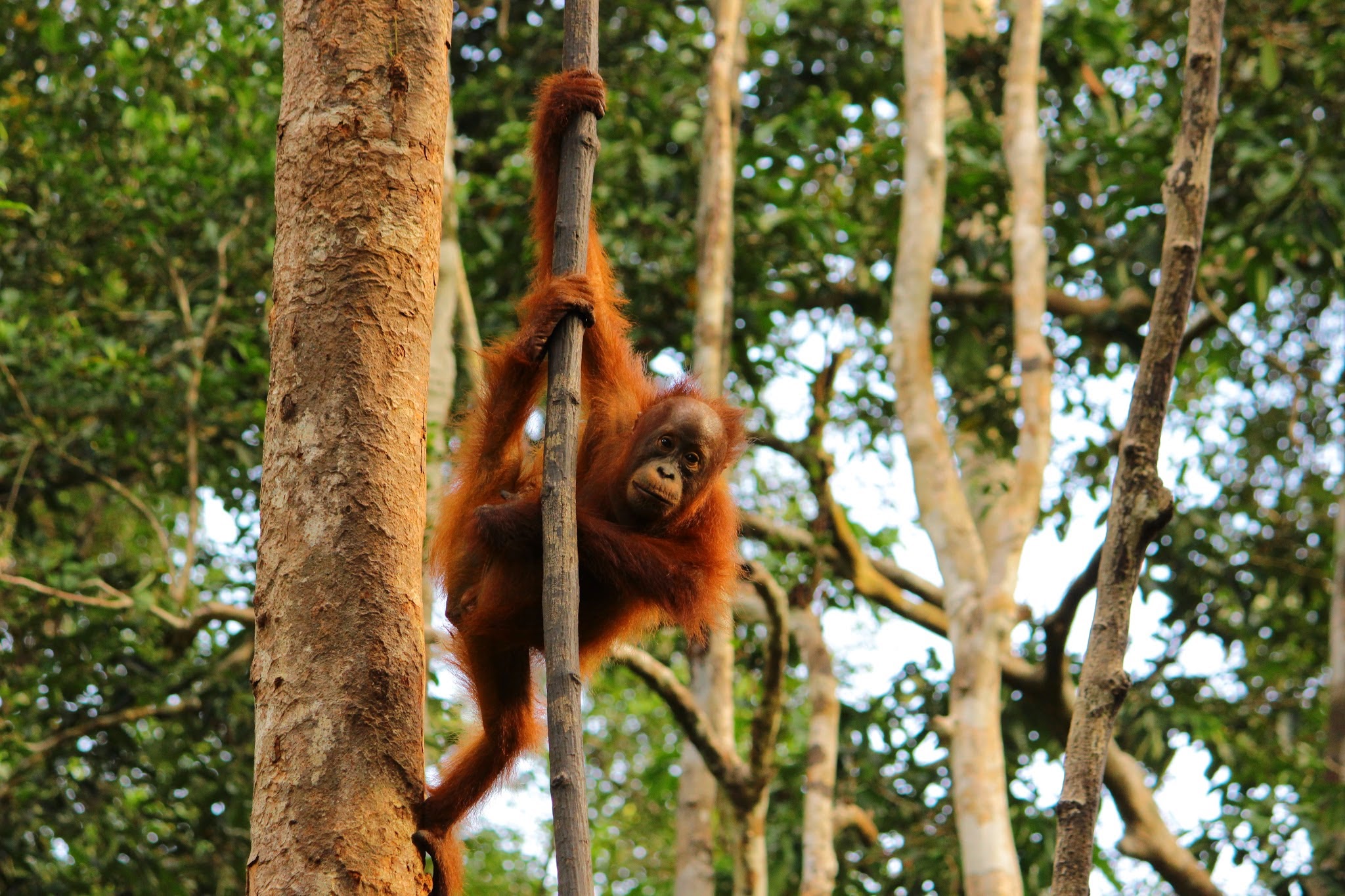 A baby Borneo orangutan climbing a tree
