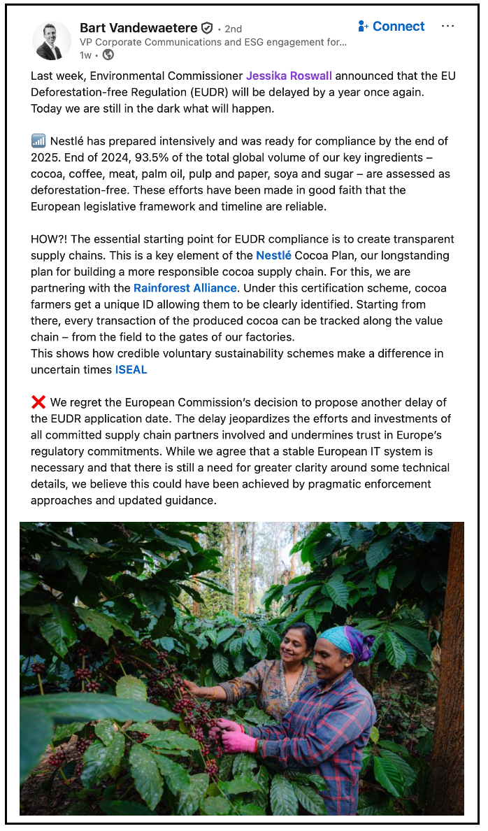 Chocolate giant Nestlé cautions that further delay “jeopardizes the efforts and investments of all committed supply chain partners and undermines trust in Europe’s regulatory commitments”.